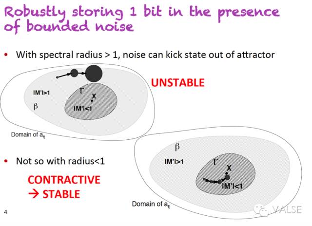 虽然这个定理比较生僻,但是图示和 intuitive 的理解很容易。大家甚至可以从 Bengio 在 ICML 2016 Back-to-the-future Workshop 上给的 talk 中获得一些启发。如果我们要稳定地去存储 1 bit information,我们需要做的就是 spectral radius 小于1:
