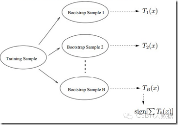 下图是Bagging的选择策略,每次从N个数据中采样n次得到n个数据的一个bag,总共选择B次得到B个bags,也就是B个bootstrap samples.