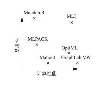 与此同时,著名的UC Berkeley AMPLab在研究基于Spark的机器学习库MLBase[9]时,从计算性能和系统易用性两个重要维度,考察了现有的大数据机器学习研究工作和系统,如图4所示。面向机器学习和数据分析时,目前已有的工作和系统,绝大多数都未能同时具备大规模分析处理能力和良好的系统易用性。