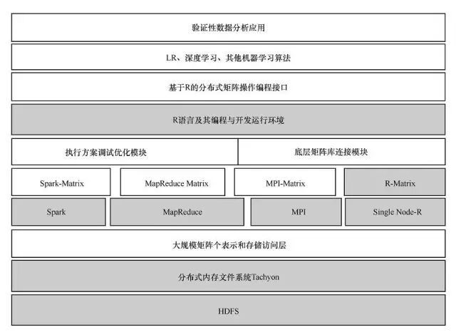 基于矩阵模型的抽象基于这样一个事实:大多数机器学习和数据分析算法都可以表示为矩阵或向量代数计算,因此可以构建一个基于矩阵计算模型的机器学习系统,允许程序员直接基于矩阵计算快速构建机器学习和数据分析算法。最典型的基于矩阵模型的大数据机器学习系统尚不多见,UCBerkeley AMP Lab推出的Spark MLlib是一个试图基于矩阵计算模型构建上层各种机器学习算法的系统;最近Spark系统提出了一个DataFrame的数据抽象机制,允许基于矩阵和表等数据结构,设计各种机器学习和数据分析算法。此外,国内由南京大学PASA大数据实验室研究开发的“Octopus(大章鱼)”系统是一个以大规模矩阵模型为中心的跨平台大数据机器学习系统。