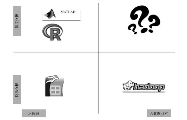 知名的Apache Flink大数据分析系统研究者在2014年VLDB会议主题报告和论文中[8],从数据分析的复杂程度和数据规模的维度,考察了现有的相关研究工作和系统,如图3所示。现有的系统要么主要用于小规模复杂分析,要么主要用于大规模的简单统计分析,缺少既具有复杂数据分析能力又具有强大的大数据处理能力的大数据分析系统;文章作者甚至认为,对于行业大数据分析人员而言,现有的工具还处于“石器时代”[8]。