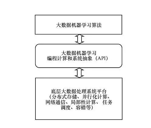 在上述技术特征中,一个非常重要的思路是,要通过系统抽象来降低系统设计的复杂性。如图2所示,一个设计良好的大数据机器学习系统,应当通过定义特定的机器学习编程计算和系统抽象接口,将上层机器学习和底层分布式系统解耦开来,将机器学习实现在现有的大数据计算平台之上,而不需要考虑底层系统层面的因素,以此实现底层大数据处理平台对上层用户的透明化,让上层用户从诸多底层的分布和并行化大数据编程计算细节中解放出来,以便他们致力于上层的机器学习模型和算法的设计实现。通过编程计算和系统抽象层API,向上提供各种机器学习编程计算接口以及学习模型和训练数据的表示,向下由底层分布式系统负责处理并提供高效的分布和并行化计算实现。